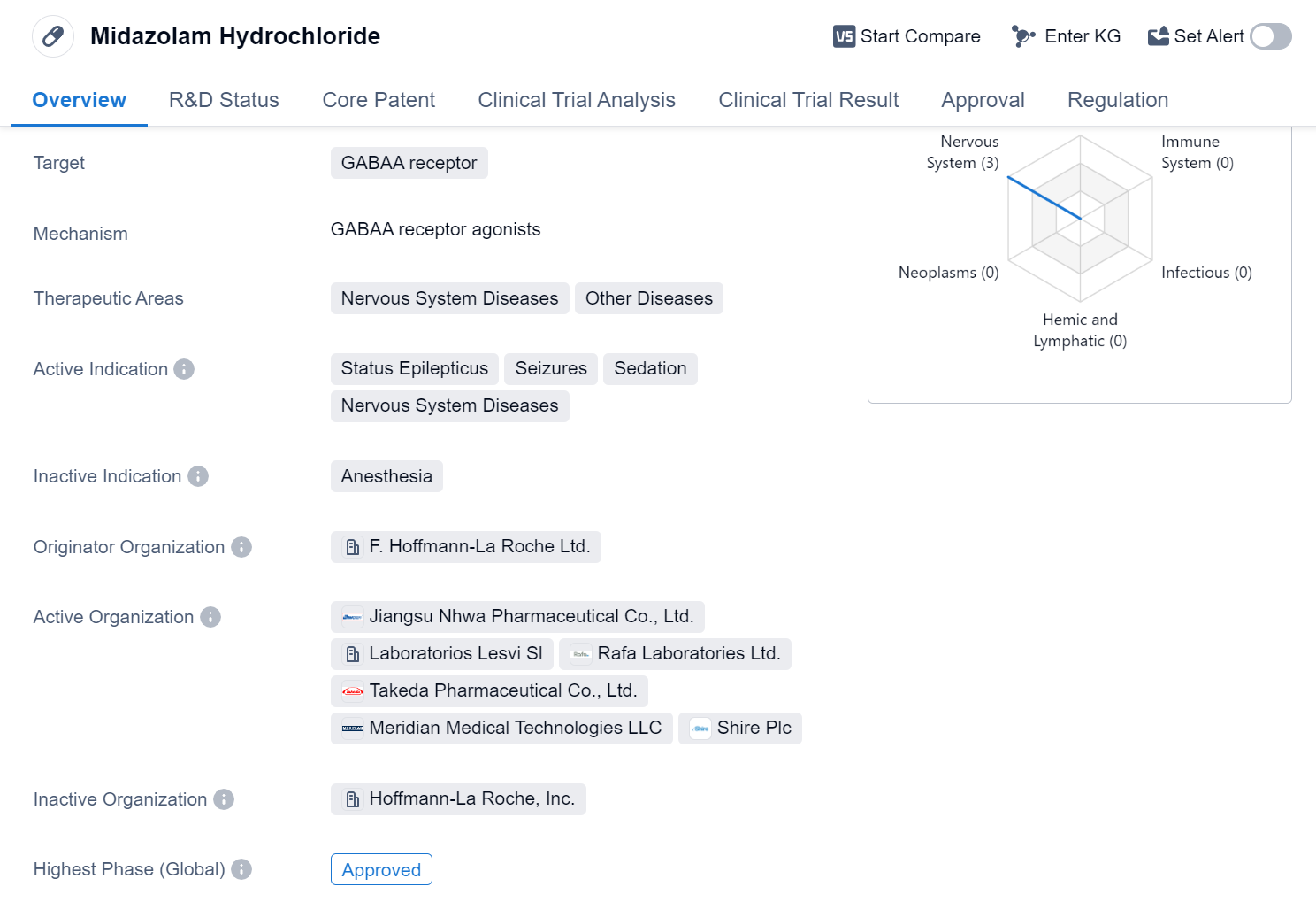 In summary, Midazolam Hydrochloride is a small molecule drug that targets the GABAA receptor. It is indicated for the treatment of nervous system diseases and other conditions, including status epilepticus, seizures, and sedation. Developed by F. Hoffmann-La Roche Ltd., the drug has received approval in the United States and China. Its priority review status reflects its significant therapeutic benefits, and its mechanism of action involves enhancing the inhibitory effects of GABA. With a long history of use, Midazolam Hydrochloride is a valuable medication in the field of biomedicine.