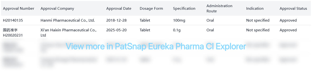 H20140135 | Hanmi Pharmaceutical Co., Ltd. | 2018-12-28 | Tablet | 100mg | Oral | Not specified | Approved |