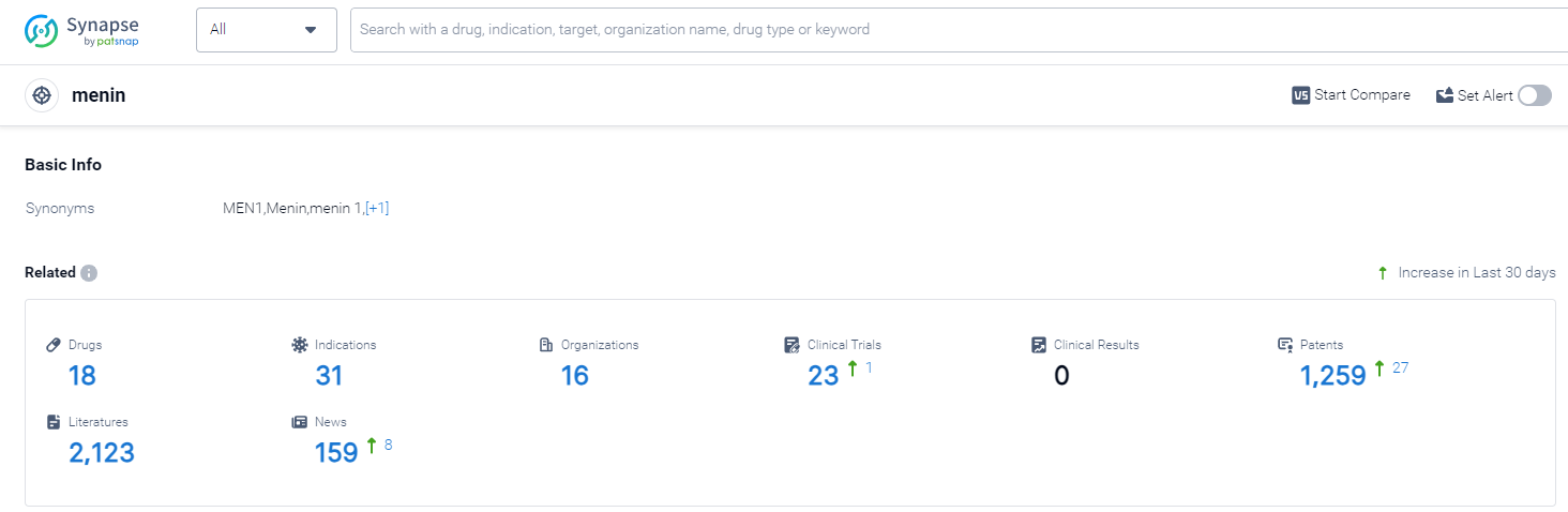 According to Patsnap Synapse, as of 13 Oct 2023, there are a total of 18 menin drugs worldwide, from 16 organizations, covering 31 indications, and conducting 23 clinical trials.