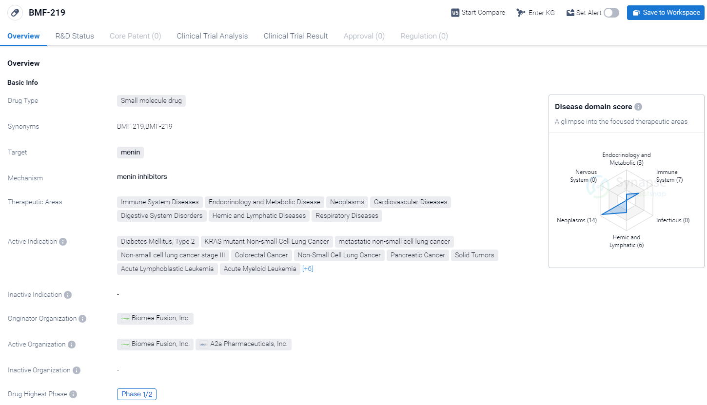 In summary, BMF-219 is a small molecule drug developed by Biomea Fusion, Inc. that targets menin. It is currently in Phase 1/2 of clinical development and has the potential to be used in the treatment of various diseases across multiple therapeutic areas. Further clinical trials will determine its safety and efficacy, and if successful, it may progress to later stages of development.