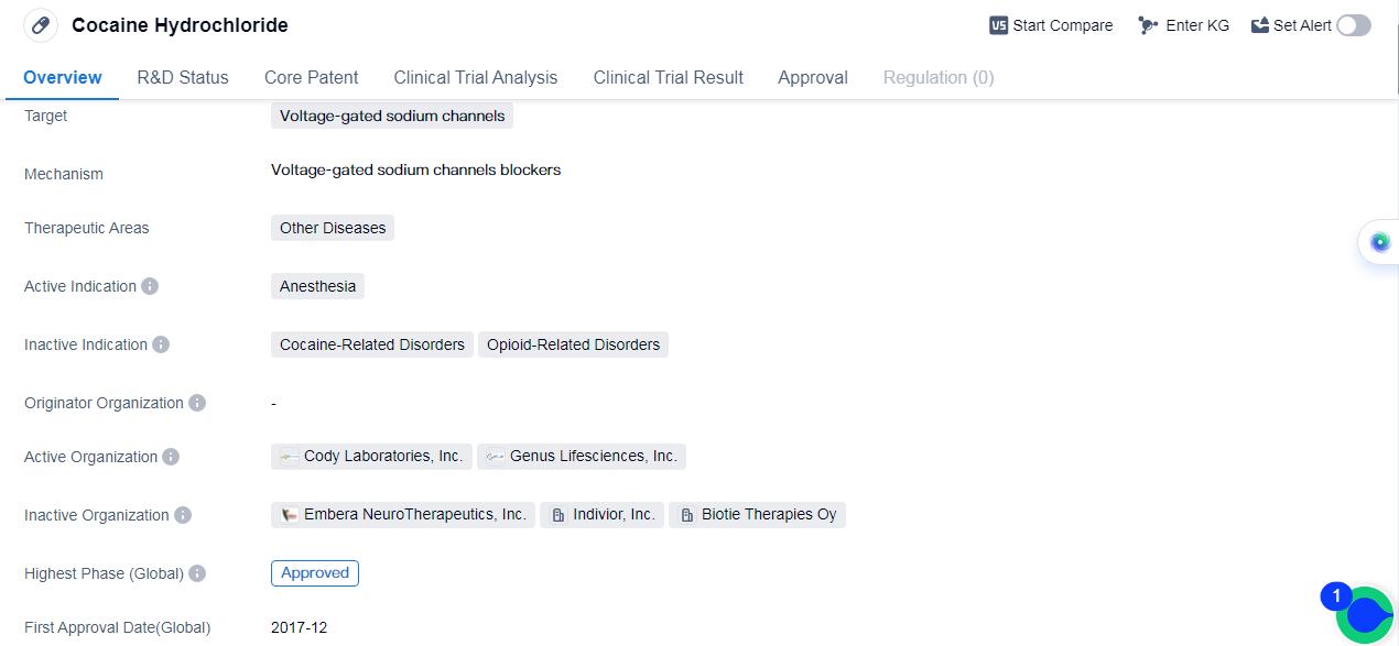 In summary, Cocaine Hydrochloride is a small molecule drug that targets voltage-gated sodium channels. It has been approved for use in anesthesia and has undergone the necessary clinical trials and regulatory processes. The drug's approval in the global markets further emphasizes its recognized safety and efficacy.